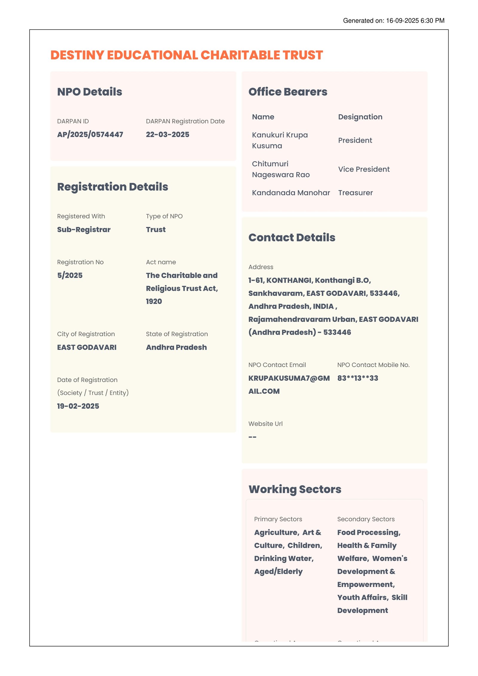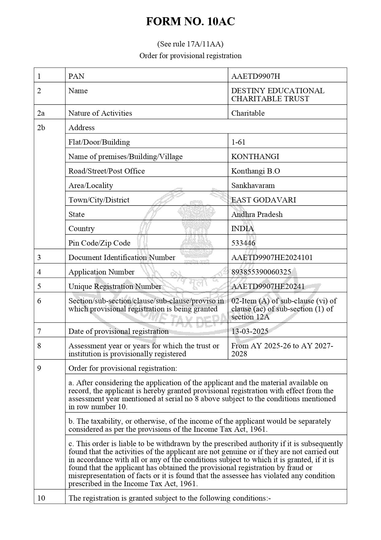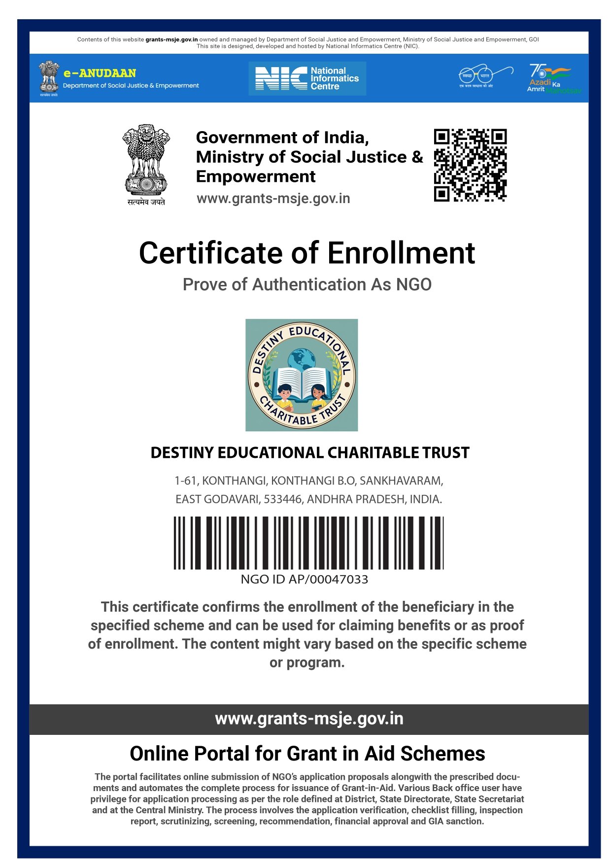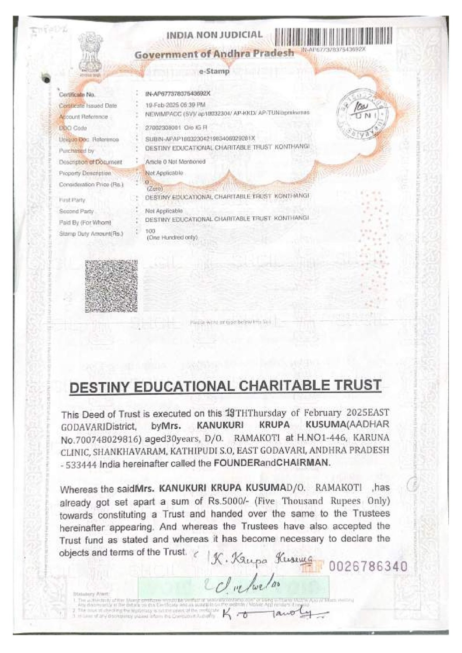 Our organization is led by a visionary leader, Sri. KANUKURI KRUPA KUSUMA, whose unwavering commitment to our cause has been the driving force behind our success. Established in 2025, since then the organization has been expanding continuously in terms of social and Educational Development and Medical services, Food, and Sheltering for Orphans. It has worked for the promotion of sustainable, equitable, and participatory development, social welfare, and social justice through Programs for social work, the Establishment of Educational Technical and Medical Institutes supportive relief and education to the people, Health services, and other human service through social research and dissemination of socially relevant knowledge, social intervention through training and field action, contribution to social and welfare policy and program at State, National and International levels, over the years, The organization has among others (NGOs, Trusts) thrusts made A significant contribution to planning, action strategies, and Human Resource Development in several areas, ranging from sustainable rural and urban development to education, health, Agriculture, and Human Rights, in all case, the focus has been on the disadvantaged and marginalized section of societies, such as women, children and tribal. At DESTINY EDUCATION CHARITABLE TRUST , we envision a world where education is a fundamental right for all. Since our inception in [2025], we have been dedicated to breaking down barriers to education, especially for marginalized and disadvantaged communities. Through our school-building initiatives, scholarship programs, and teacher training, we are working towards creating a brighter future for children and youth, empowering them with the knowledge and skills they need to succeed.